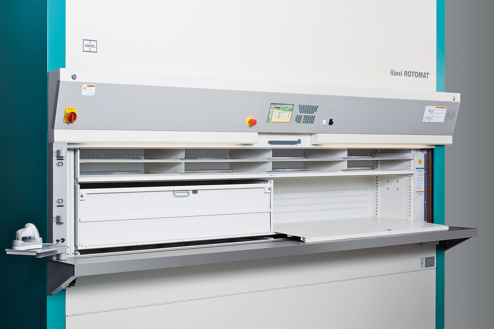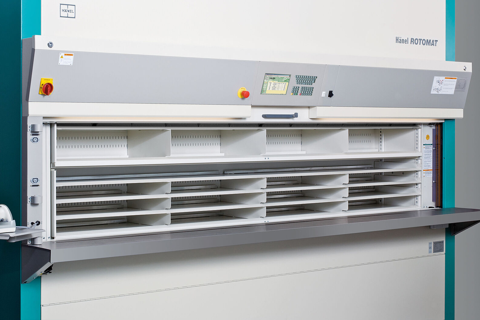 The Hänel Rotomat® storage carousel makes use of the available room height and creates up to 60 % more storage capacity thanks to its compact design. This means costly warehousing space can be used more efficiently. No more bending, ladder-climbing or walking long distances to search for and store parts or articles. The required items are brought automatically to the optimum ergonomic retrieval height.